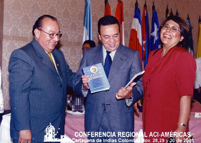 El Presidente de la ACI - MUNDIAL con sede en Ginebra (Suiza) Dr. Roberto Rodríguez (Brasileño) exhibiendo el libro “Gestión Cooperativa para ser Competitivos” en el marco de la Conferencia de la ACI. Libro que lo Prologó con todos los honores. |