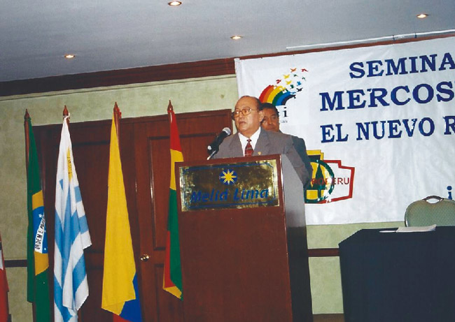 Desarrollando su Conferencia sobre “Integración Cooperativa Regional” en el marco del Seminario Internacional sobre “Mercosur y el nuevo Reto de la Integración Cooperativa” en Lima Perú |