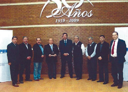Los Dirigentes de la Cooperativa de Chile CAPUAL del Sector Aéreo después de haber entregado una PLACA de Reconocimiento al Dr. Arnold Encomendero D. en Febrero 2011. en Santiago de Chile después de su Conferencia. |